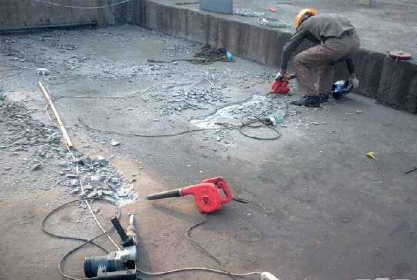 1)用电锤在穿墙套管周围开凿上口宽5 cm,下.口宽3 cm的八字凹槽,槽底距套管口4 cm;并在底部形成上口宽2 cm,下口宽1 cm,深1 cm的预留凹槽;清理凹槽表面残渣和浮灰。
